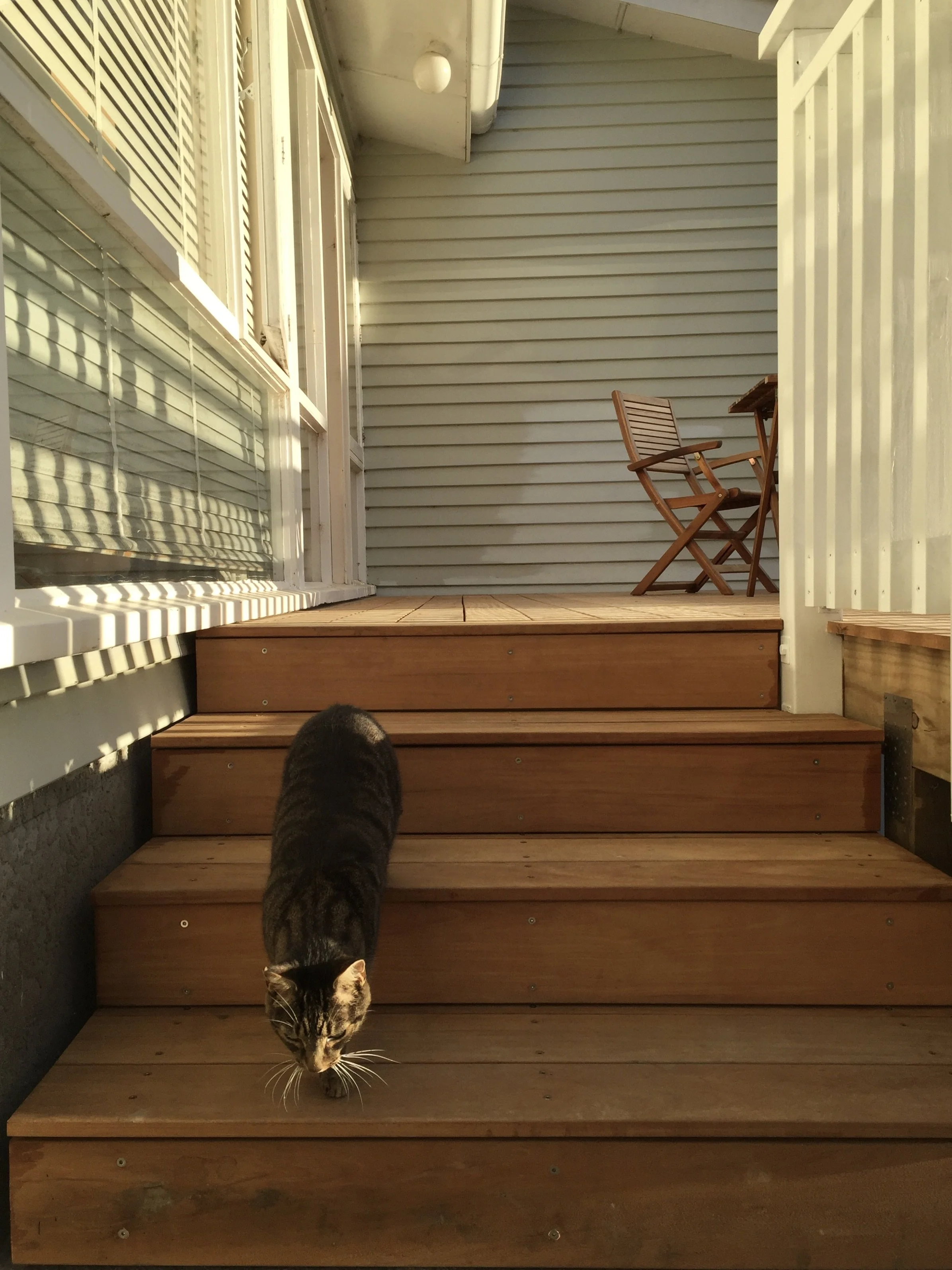 The 1960s split-level weatherboard house was in original condition. The client - an admirer of the era’s architecture and design - was committed to retaining its distinctive form and character. However, the front door entry was problematic: access was via a narrow, cracked concrete driveway leading to a steep flight of open-tread timber stairs with a charming yet non-compliant cast iron balustrade.