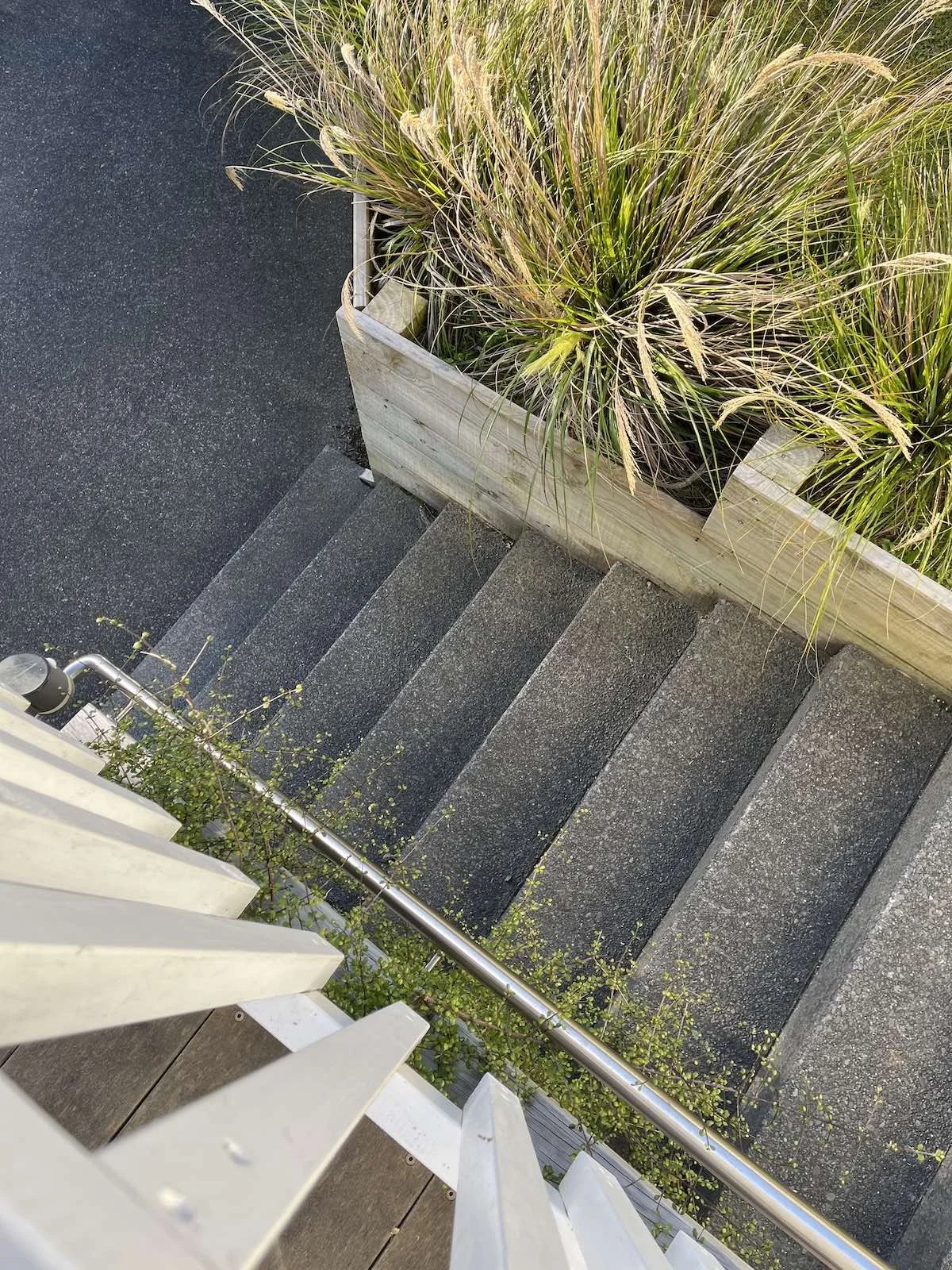 The solution is a carefully proportioned hardwood deck supported by a slender steel beam, allowing for generous, open concrete steps in exposed aggregate. The aggregate’s texture provides slip resistance and visual richness. A new timber retaining wall - softened and partially concealed with native planting - replaces the constricted driveway, alongside exposed aggregate concrete paving that improves both access and arrival.